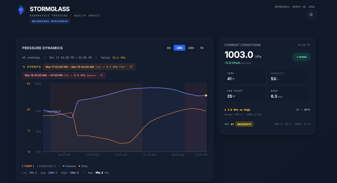The UI and feature set were inspired by a very outdated weather website I used for years to watch pressure graphs and anticipate bad symptom days — Stormglass modernizes that idea and expands it beyond pressure alone.