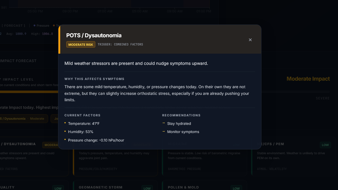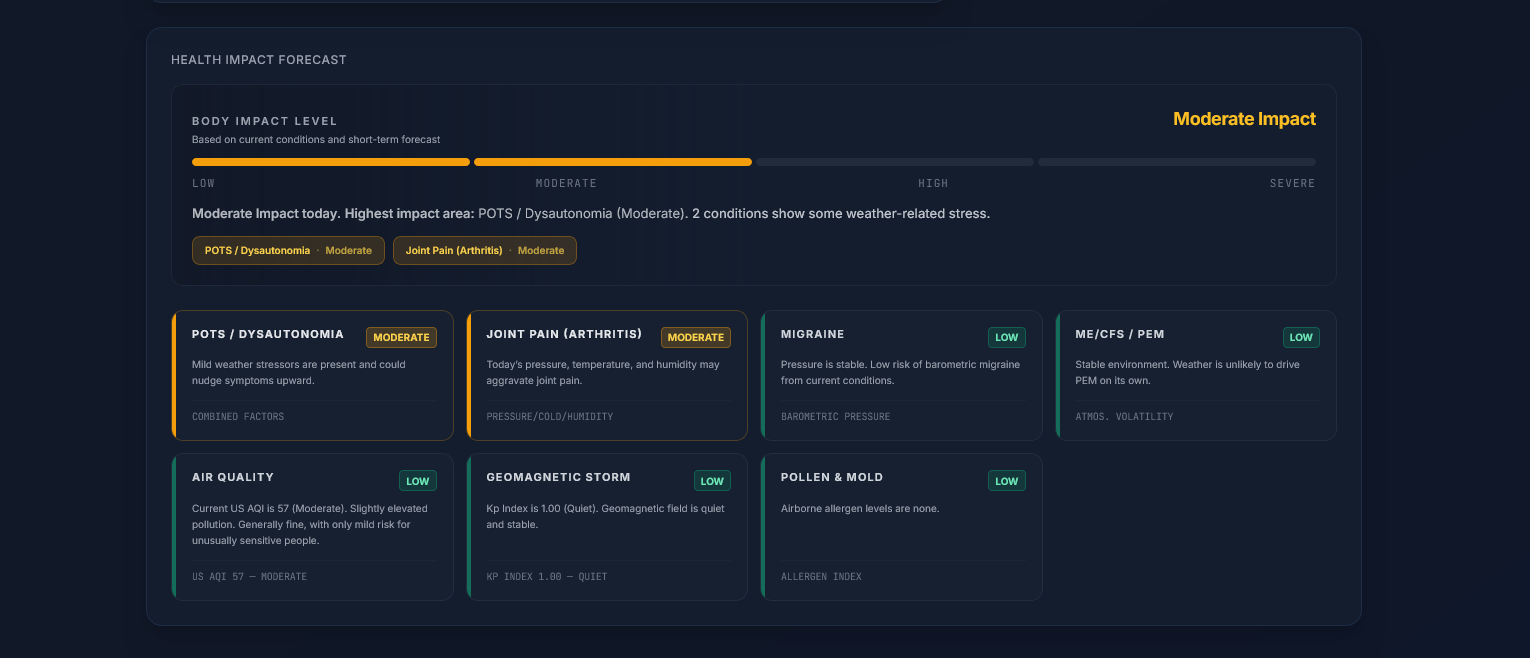 Evaluates 7 health conditions against current environmental data: POTS/Dysautonomia, Joint Pain, Migraine, ME/CFS/PEM, Air Quality, Geomagnetic Storms, and Pollen & Mold. Each condition gets a Low/Moderate/High/Severe risk level with a plain-language explanation of which factors are driving it. A composite “Body Impact Level” bar summarizes overall flare risk at a glance.